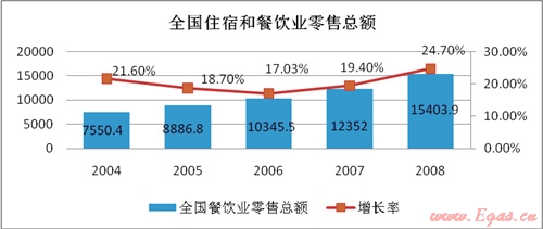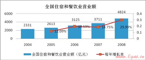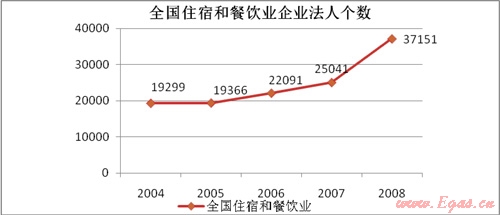 從國家統(tǒng)計局網(wǎng)站上了解到2008年我國從事住宿和餐飲的企業(yè)法人有37151個,全國餐飲業(yè)營業(yè)額已達到4824億元,每年的復合增長率達到20%。