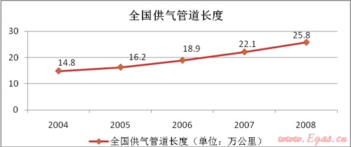 由于瓶裝氣由單獨的配套計量儀器,同時我國《城鎮(zhèn)燃氣技術(shù)規(guī)范》規(guī)定使用管道燃氣的用戶應(yīng)設(shè)置燃氣計量裝置。因此,燃氣管道的建設(shè)將直接影響燃氣表市場。根據(jù)《全國城市燃氣管網(wǎng)改造規(guī)劃(2008-2010)》,1990年至2006年,城市燃氣行業(yè)供求管道長度從2.4萬公里增加到18.9萬公里,增加了近7倍。2002年至2006年,城市燃氣管道年增長1.42-2.74萬公里,平均增長率超過13%,而天然氣管道的平均增長率則超過20%。