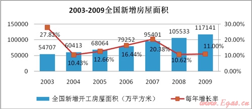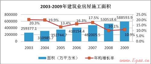 燃氣表業(yè)務(wù)與房產(chǎn)市場發(fā)展密切相關(guān)。2003年-2009年建筑房屋施工面積由259,377萬平方米增加到588,593萬平方米,年均增長14.6%。