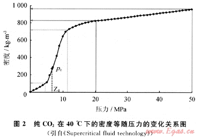 臨界流體是指溫度、壓力高于臨界溫度(Tc)和臨界壓力(pc)的流體。在臨界點(diǎn)附近,壓力的微小變化可導(dǎo)致密度的巨大變化[9]。如圖1、2。圖1中,C點(diǎn)為流體臨界點(diǎn),虛線所標(biāo)注的數(shù)值為流體密度。由圖1可以看出,在C點(diǎn)附近小的范圍內(nèi),流體的密度差異巨大,也即流體密度差異很大的數(shù)值線延伸并聚集在臨界點(diǎn)C附近。在此點(diǎn),較小的溫度或壓力發(fā)生變化,都會(huì)引起流體密度或體積的巨大變化。純二氧化碳的臨界溫度是31.06℃,臨界壓力是7.39MPa,如圖2描述了純二氧化碳在40℃下的密度隨壓力的變化關(guān)系。溫度40℃恒定的條件下,壓力從10MPa降到5MPa,在臨界壓力附近變化,密度數(shù)值從630kg/m3降到120kg/m3,變化劇烈;可見(jiàn)在臨界點(diǎn)附近,密度有很寬的變化范圍;溫度或壓力微調(diào)可使密度顯著變化。