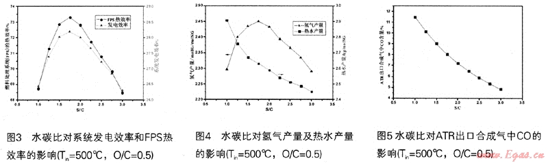 對(duì)于整個(gè)系統(tǒng)來(lái)說(shuō),水碳比是重要的操作參數(shù),對(duì)系統(tǒng)的效率會(huì)產(chǎn)生重要的影響。高水碳比可以防止重整催化劑上積碳的產(chǎn)生,有利于重整反應(yīng)向產(chǎn)物方向進(jìn)行,從而提高氫氣的產(chǎn)率,但是高水碳比會(huì)導(dǎo)致整個(gè)系統(tǒng)的能耗較大,需要很多額外的能量來(lái)產(chǎn)生高溫蒸汽,因而可能會(huì)降低燃料處理系統(tǒng)的熱效率。所以要從系統(tǒng)效率的角度去考慮合適的水碳比。圖3-5顯示了自熱重整進(jìn)料溫度為500℃,氧碳比為O.5時(shí),水碳比對(duì)發(fā)電效率、燃料處理系統(tǒng)(FPS)熱效率,氫氣產(chǎn)量(molH2/molNG)、系統(tǒng)熱水產(chǎn)量(kg/molNG)DATR出口合成氣中CO含量的影響。