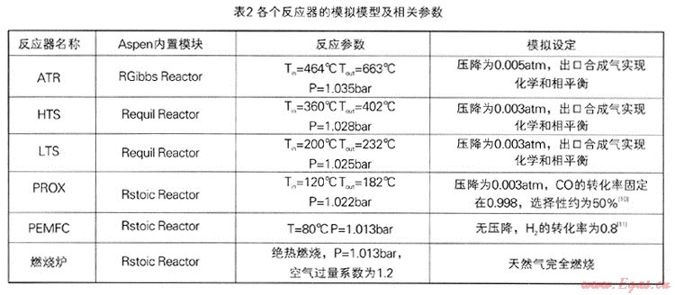 ATR,HTS,LTS和PROX反應(yīng)器在模擬過(guò)程中處理為絕熱系統(tǒng),ATR,HTS,LTS反應(yīng)器出口的合成氣處于出口溫度下的化學(xué)平衡狀態(tài),出口溫度由入口物流溫度及絕熱溫升決定。表2列舉了各個(gè)反應(yīng)器在模擬過(guò)程中Aspen內(nèi)置的模塊及相關(guān)的參數(shù)。