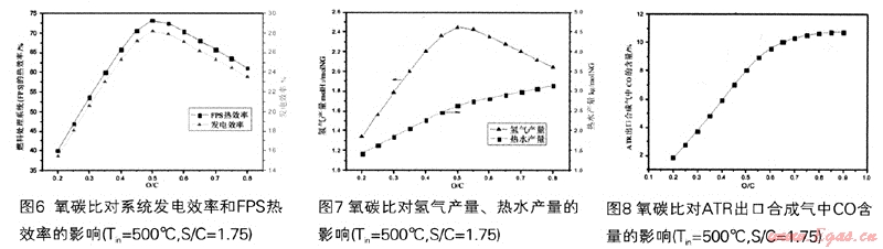 氧碳比對(duì)于自熱重整制氫技術(shù)是一個(gè)重要的參數(shù)。隨著氧碳比的增大,甲烷氧化反應(yīng)增強(qiáng),因此ATR合成氣中CO的含量也會(huì)增大,如圖8所示。氧化反應(yīng)的進(jìn)行使反應(yīng)溫度升高,ATR出口合成氣溫度升高,熱水產(chǎn)量也會(huì)隨之增大,如圖7所示。反應(yīng)溫度的提高也會(huì)使強(qiáng)吸熱的蒸汽重整反應(yīng)加強(qiáng),H2產(chǎn)量也會(huì)有所提高,但是當(dāng)0/C>O.5以后,過(guò)多的氧氣在高溫狀況下會(huì)消耗氫氣,這樣會(huì)導(dǎo)致H2產(chǎn)量的下降。O/C=0.5時(shí),H2產(chǎn)量達(dá)到最大(2.45molH2/molNG),系統(tǒng)發(fā)電效率和FPS的熱效率都在峰值處(28.2%,73.3%),如圖6所示。