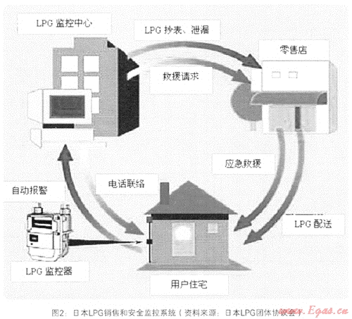 在安全管理方面,經(jīng)營(yíng)者在用戶處設(shè)置安全監(jiān)控系統(tǒng),并與用戶信息管理系統(tǒng)整合為一體,通過(guò)信息監(jiān)控中心可以隨時(shí)掌握用戶的安全和用氣情況。根據(jù)日本LPG團(tuán)體協(xié)議會(huì)所提供的資料,用戶安全監(jiān)控系統(tǒng)自上世紀(jì)80年代中期開始推廣,到90年代中期普及率基本達(dá)到100%,LPG用戶事故也從500起/年以上下降到100起/年左右,顯著提高了LPG使用的安全性。