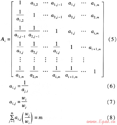 成對(duì)比較矩陣Ai為正倒值矩陣,矩陣中各要素不僅為正數(shù),且具有倒數(shù)特征。成對(duì)比較矩陣如下:
