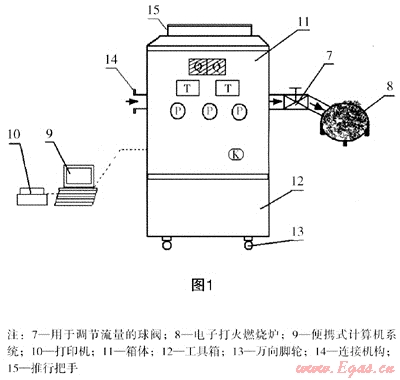 B. 箱體外觀:為在線實流檢測的方便性,將裝置設(shè)計為可移動式箱體,箱體下部設(shè)有工具箱,以提高其便攜性。為了方便其移動,裝置箱體頂部設(shè)計有推行把手,箱體底部設(shè)有萬向腳輪,箱體內(nèi)設(shè)有與檢定管路相連接的一臺或相并聯(lián)的一臺以上的標準表,標準表選用高準確度氣體腰輪流量計,檢定管路的進氣端設(shè)有可與被檢表連接的連接機構(gòu),標準表前后及被檢表后均設(shè)有一段直管段,在每一臺標準表前的管路上均設(shè)有流量調(diào)節(jié)閥,為了提高測量準確度,在標準表前設(shè)有凈化燃氣的過濾器。在每一臺標準表前后的管路上設(shè)置有與便攜式計算機系統(tǒng)連接的壓力傳感器和溫度傳感器,在檢定管路的末端設(shè)有與其連接的燃燒爐,以保證防止大氣污染。