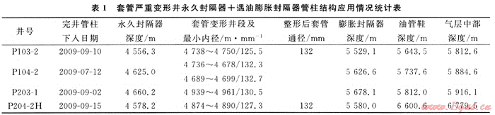 普光氣田套管變形井發(fā)生后,通過普光氣田主體嚴重套管變形井綜合修井技術(shù)研究,采用井下震擊整形技術(shù)、滾壓整形技術(shù)實現(xiàn)套管擴徑,普光103-2、204-2H井整形后通徑達到132~134mm,保證小直徑遇油膨脹封隔器下井的要求;2009年7~9月份應(yīng)用外徑130mm遇油膨脹封隔器,采用“永久封隔器+遇油膨脹封隔器”采氣管柱結(jié)構(gòu),先后完成了普光103-2、104-2、203-1定向井、204-2H水平井投產(chǎn)作業(yè)施工,現(xiàn)場應(yīng)用效果較好(見表1),對高含硫嚴重套管變形井修井投產(chǎn)具有重要現(xiàn)實意義。