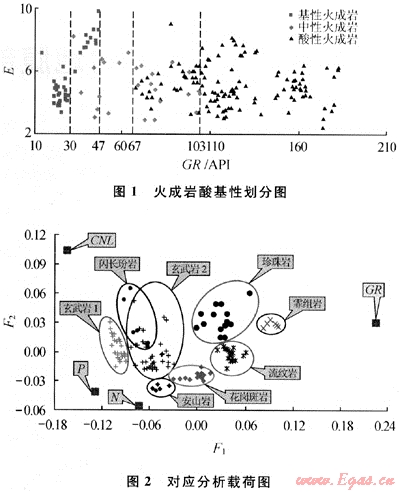 為了避免載荷圖上數(shù)據(jù)點(diǎn)過多影響對(duì)應(yīng)分析,首先得從樣本中挑選一些典型的、易于歸位的樣品用于對(duì)應(yīng)分析研究。利用對(duì)應(yīng)分析發(fā)現(xiàn)GR對(duì)研究區(qū)的火成巖巖性反應(yīng)最為敏感,圖1為利用GR對(duì)研究區(qū)火成巖酸基性的劃分,從另外一個(gè)角度驗(yàn)證了對(duì)應(yīng)分析的正確性。CNL、P與N對(duì)研究區(qū)的巖性反應(yīng)次之。