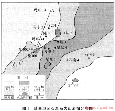 本區(qū)石炭系火山巖巖相分布基本確定,大致呈北東-南西向的條帶狀分布,西北部地區(qū)絕大部分是噴溢相的基性火山巖,向東南依次過渡為爆發(fā)相火山巖、噴溢相的中性火山巖;向北西方向再次出現(xiàn)了爆發(fā)相火山巖,該地區(qū)東南角是噴溢相的中酸性火山巖。從地震剖面上識(shí)別出本區(qū)有4個(gè)比較明顯的古火山口。在石炭紀(jì)時(shí)期,本區(qū)經(jīng)歷了大范圍的火山爆發(fā),噴發(fā)出的大量巖漿沿地勢向四周擴(kuò)散,巖漿由西北角的基性逐漸向南東過渡為中酸性。儲(chǔ)集條件也是由西北向東南逐漸變好,所以位于陸西地區(qū)東南部的石西凸起應(yīng)作為下一步勘探的重點(diǎn)區(qū)域。