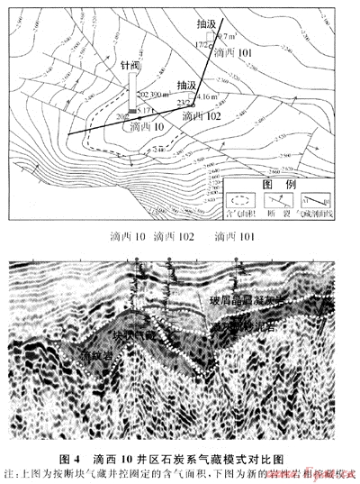 2) 滴西10井區(qū)。滴西10井鉆于2003年,石炭系巖性為流紋巖,2004年在石炭系試氣2層均獲得高產(chǎn)工業(yè)氣流。按照頂面構(gòu)造控藏模式,2004、2005年分別鉆探滴101井和滴102井2口評價井,石炭系巖性均為凝灰?guī)r,無油氣顯示。2005年底,按斷鼻構(gòu)造氣藏圈定滴西10井井控面積4.74km2(圖4中的上圖),探明天然氣地質(zhì)儲量20.20×108m3。2006年,對滴西10井區(qū)按巖性圈閉模式進(jìn)行了重新解釋,提出了新的氣藏模式(圖4中的下圖),并對滴102井進(jìn)行了加深鉆探以驗證新模式。滴102井于3310m開始加深,3460m完鉆,至3340~3370m井段鉆遇流紋巖與滴西10井出氣段巖性一致。鉆探結(jié)果證實了新模式的正確性,指導(dǎo)了后續(xù)探井的部署。2008年,按照巖性巖相控藏模式,鉆探了滴103井和滴104井,均獲得成功,新增含氣面積13.57km2,新增探明天然氣地質(zhì)儲量83.07×108m3。