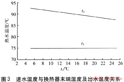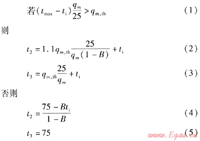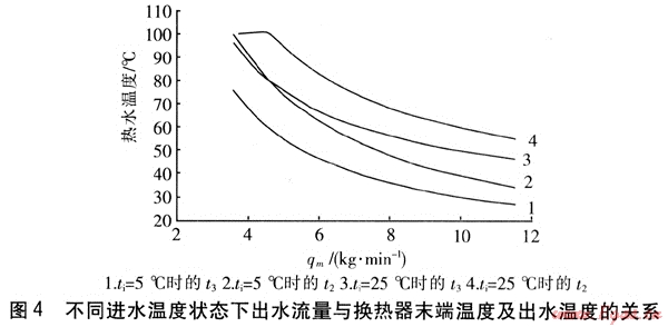 依據(jù)上述的計(jì)算公式對各狀態(tài)(如出水流量變化)分析可得出正常使用的溫度范圍為t2<92.5℃,t3<75℃。再依據(jù)圖2可推算出t1<75.5℃。
