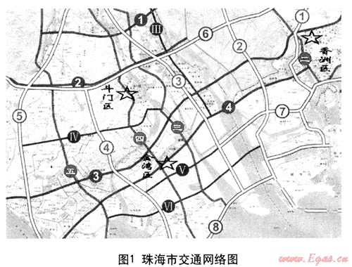珠海市位于珠江口西南部,緊鄰澳門特別行政區(qū),是我國早期設(shè)立的經(jīng)濟(jì)特區(qū)之一。設(shè)香洲區(qū)、斗門區(qū)、金灣區(qū)三個(gè)市轄區(qū),總?cè)丝?50~350萬人。現(xiàn)階段,珠海市只有單一的公路運(yùn)輸交通模式。如圖1珠海市交通網(wǎng)絡(luò)圖所示,珠海市由5縱4橫共9條主干道,6條加密線及8條城際高速公路組成的交通系統(tǒng)。車流輛呈3個(gè)圈的片區(qū)狀布置,片區(qū)之間為30~60min車程,并呈現(xiàn)香洲區(qū)強(qiáng),其他兩市轄區(qū)弱(其他兩市轄區(qū)之和遠(yuǎn)小于香洲區(qū))??梢?,加氣站的重點(diǎn)、難點(diǎn)應(yīng)放在香洲區(qū)加氣站的網(wǎng)絡(luò)布置。結(jié)合珠海市交通現(xiàn)狀,加氣站投建初期會(huì)呈現(xiàn)香洲區(qū)數(shù)目多、規(guī)模較大,其他兩市轄區(qū)較少的分布格局。