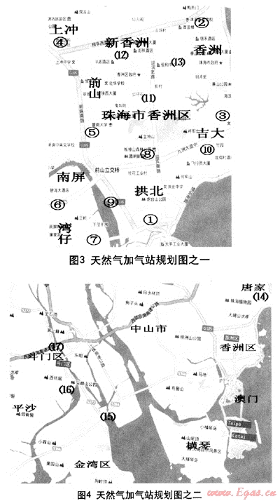 圖3中13座氣化站密集分布在香洲區(qū)內(nèi),各加氣站間距根據(jù)供氣需求均衡布置,控制車輛空載加氣距離在3km之內(nèi)。圖4中共4座加氣站,其中唐家一座,斗門區(qū)、金灣區(qū)共3座,由于用氣車源較少,控制范圍較大,加氣站應(yīng)布置在主干道交匯車流較多處(如湖心路口、尖峰山等)。圖中加氣站位置為規(guī)劃點(diǎn),詳細(xì)定點(diǎn)與國土部門進(jìn)行深化。