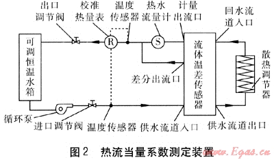 熱量表是用熱量計(jì)量裝置,它關(guān)心的是供回水溫差。直接測(cè)定熱用戶供回水溫差并將其實(shí)時(shí)轉(zhuǎn)換為流量信號(hào),可省去傳統(tǒng)熱量表計(jì)算供回水溫差、流量?jī)蓚€(gè)環(huán)節(jié),簡(jiǎn)化熱量表結(jié)構(gòu)。流差式熱量表就是基于這一思想設(shè)計(jì)的,采用流體溫差傳感器附加一塊熱水流量計(jì),實(shí)現(xiàn)對(duì)用熱量的計(jì)量。目前,我國供熱科研人員針對(duì)我國供熱系統(tǒng)現(xiàn)狀,提出了多種供熱計(jì)量方法[1~9]。本文對(duì)流差式熱量表計(jì)量原理及熱流當(dāng)量系數(shù)的測(cè)定進(jìn)行探討。