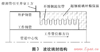 內(nèi)外管之間設(shè)波紋端封。為避免事故狀態(tài)下井室進(jìn)水導(dǎo)致保溫層進(jìn)水,需將內(nèi)外管之間封閉。但內(nèi)外管相對(duì)位移較大,封閉裝置采用不銹鋼波紋端封形式,波紋端封補(bǔ)償量按內(nèi)外管相對(duì)位移選取,經(jīng)計(jì)算波紋端封補(bǔ)償量為1050mm。這樣有效地解決了保溫層進(jìn)水及內(nèi)外管相對(duì)位移的問(wèn)題。波紋端封結(jié)構(gòu)見(jiàn)圖3。