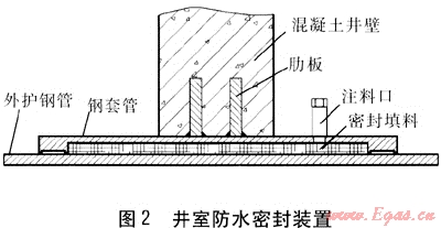 管道穿井室采用井室防水密封裝置,DN 600mm管道外管的外徑為1020mm,外管計(jì)算熱伸長(zhǎng)為185mm,如果外管與井壁采用止水環(huán)剛性連接,限制外管的位移,則外管對(duì)井室的推力將達(dá)到6200kN。采用傳統(tǒng)的柔性密封方式可靠性較差。解決這一問(wèn)題的方法有兩個(gè):①外管加裝波紋管補(bǔ)償器,但又存在波紋管補(bǔ)償器長(zhǎng)期浸于水中檢修、維護(hù)問(wèn)題。②外管與井壁連接處采用防水性能較為可靠的井室防水密封裝置,此裝置結(jié)構(gòu)與套筒補(bǔ)償器結(jié)構(gòu)相似,確保了井室整體的防水性。經(jīng)研究,在此工程中采用了井室防水密封裝置,通過(guò)專用注料器把密封填料通過(guò)注料口壓進(jìn)填料空腔,這樣在保證外管自由伸縮的同時(shí)也阻止水滲漏入井室。井室防水密封裝置見(jiàn)圖2。