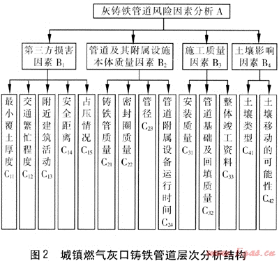城鎮(zhèn)燃?xì)夤艿朗且粋€(gè)十分復(fù)雜的系統(tǒng),它要涉及大量的相關(guān)因素,如第三方損害、管道及其附屬設(shè)施本體質(zhì)量、腐蝕因素、施工質(zhì)量、土壤影響因素、最小覆土厚度、交通繁忙程度、占?jí)呵闆r、管徑等。面對(duì)這樣一個(gè)復(fù)雜系統(tǒng),單用定性方法研究肯定是行不通的,如果用定量方法來(lái)研究,就需要構(gòu)造數(shù)學(xué)模型來(lái)模擬。在構(gòu)造模型的過(guò)程中需要大量的數(shù)據(jù)資料,但是許多因素還是不能單純用數(shù)據(jù)來(lái)表示,這就要把大系統(tǒng)分為若干個(gè)相互關(guān)聯(lián)的子系統(tǒng),將問(wèn)題層次化,然后再根據(jù)不同因素的重要性程度進(jìn)行評(píng)價(jià)。