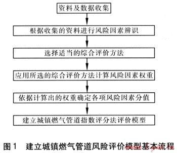 對(duì)城鎮(zhèn)燃?xì)夤艿肋M(jìn)行風(fēng)險(xiǎn)評(píng)價(jià),就是建立一套科學(xué)的評(píng)價(jià)體系,通過(guò)科學(xué)的評(píng)價(jià)方法獲得管道綜合的風(fēng)險(xiǎn)指標(biāo),這一指標(biāo)應(yīng)能客觀(guān)地描述特定的燃?xì)夤艿赖娘L(fēng)險(xiǎn)狀況。在現(xiàn)階段城鎮(zhèn)燃?xì)怙L(fēng)險(xiǎn)評(píng)價(jià)技術(shù)方法中,普遍采用的是指數(shù)評(píng)分法。應(yīng)用指數(shù)評(píng)分法建立城鎮(zhèn)燃?xì)夤艿里L(fēng)險(xiǎn)評(píng)價(jià)模型基本流程見(jiàn)圖1。