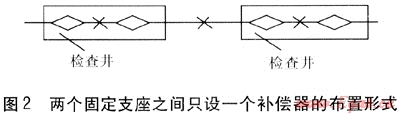 造成這種情況的原因較為復(fù)雜:一是補(bǔ)償器自身質(zhì)量偏差較大,雖型號規(guī)格相同但剛度差距大,無法自由伸縮;二是受管材加工制作質(zhì)量與安裝質(zhì)量影響,無法自由伸縮,駐點(diǎn)兩側(cè)管道受力不均,造成駐點(diǎn)偏移大,駐點(diǎn)不固定,使波紋管補(bǔ)償器無法承受,最終造成破壞。除非對補(bǔ)償器自身作較大改進(jìn),保證波紋間均布限位使波紋管補(bǔ)償器剛度均衡趨于一致,否則采用普通補(bǔ)償器條件下,還應(yīng)按照每兩個固定支座之間只設(shè)一個補(bǔ)償器的原則進(jìn)行布置(見圖2)。