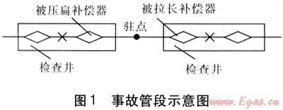 在直埋管道管系中,為減少固定支座的數(shù)量,往往布置成“駐點(diǎn)”形式。直埋管道兩個規(guī)格型號相同的相鄰補(bǔ)償器之間管道中點(diǎn)不設(shè)固定點(diǎn),當(dāng)管道受熱均勻膨脹時,在兩個補(bǔ)償器中間必然形成一個力的相對平衡點(diǎn),即駐點(diǎn)。理論上以該點(diǎn)為界,管道向左右兩個方向均勻膨脹,一般認(rèn)為,力的平衡點(diǎn)會因管道受力不均勻而發(fā)生少許偏移,一般按20%余量進(jìn)行考慮。筆者認(rèn)為,這種布置方式值得商榷。武威市城南集中供熱有限責(zé)任公司有一段直埋管道(Ø630×10)采用這種布置方式,固定支座之間距離為206m,兩只補(bǔ)償器規(guī)格型號完全相同,補(bǔ)償量均為150mm。在2008年熱網(wǎng)運(yùn)行中,其同側(cè)兩個補(bǔ)償器相繼發(fā)生故障,拆解后發(fā)現(xiàn),一個補(bǔ)償器已被壓扁,壓縮量200mm,另一個不僅未起到補(bǔ)償壓縮作用,反而被拉長50mm,一個補(bǔ)償器伸長對另一個補(bǔ)償器造成過度壓縮,從而使兩個補(bǔ)償器均發(fā)生破壞失效,事故管段示意圖見圖1。