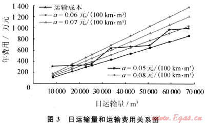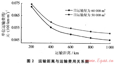 圖2為當(dāng)日運(yùn)輸量為50000m3和60000m3時(shí)的運(yùn)輸距離與單位運(yùn)輸成本的關(guān)系。由圖2可知,當(dāng)日運(yùn)輸量一定時(shí),運(yùn)輸距離越遠(yuǎn),單位運(yùn)輸成本越低。因此運(yùn)輸企業(yè)應(yīng)根據(jù)運(yùn)輸距離的遠(yuǎn)近及運(yùn)輸量的大小制定不同的合理運(yùn)輸價(jià)格。