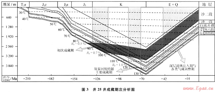 與筆者所恢復(fù)的井25井古地溫梯度和埋藏史及生烴史對照,可得到井25井成藏期次分析圖(圖3)。由圖2可知,在古地溫為90℃左右時(shí),須家河組處于白堊系地層沉積初期,此階段須家河組烴源巖成熟度Ro為0.5%~0.7%,為生烴早期階段,煤系烴源巖以生成部分液態(tài)烴和濕氣為主,屬于低演化系列烴類,絕對數(shù)量有限,但可優(yōu)先占據(jù)儲層原生孔隙,且因儲層巖石沒有完全壓實(shí)而物性較好,利于烴類高效運(yùn)聚,為初次成藏期。第二階段均一溫度為115~125℃,對應(yīng)白堊系地層沉積后期,烴源巖成熟度(Ro)為0.9%~1.0%以上,進(jìn)入須家河組生烴高峰期。由于樣品包裹體分布不均等因素,使得在分析的樣品中所測得的該期包裹體均一溫度數(shù)量不多,但這是須家河組烴源巖大量生烴階段,以生成煤成氣為主,氣體干濕度適中并含少量凝析油。因此應(yīng)屬于須家河組烴源的主要成藏期。