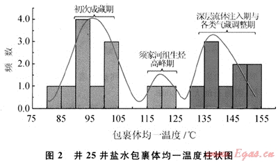 井25井須家河組儲層兩種鹽度值反映存在2種烴源產(chǎn)物,其中第一種較低鹽度(NaCl質(zhì)量分?jǐn)?shù)為6.6%~8.0%)對應(yīng)較高的均一溫度范圍(115~150℃),應(yīng)為演化程度較高的油氣所伴生;第二種較高的撲度(NaCl質(zhì)量分?jǐn)?shù)為21.8%~22.1%)和較低均一溫度范圍(82~102℃),是剛進(jìn)入大量生烴階段的產(chǎn)物(表1)。統(tǒng)計(jì)井25井須家河組儲層與烴類包裹體伴生的鹽水包裹體均一溫度,繪制包裹體均一溫度柱狀圖(圖2),可見均一溫度存在3個(gè)主要峰溫,對應(yīng)3個(gè)溫度范圍:90~105℃、115~125℃以及130~155℃。