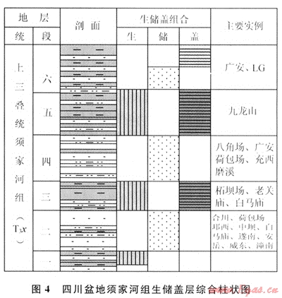 四川盆地上三疊統(tǒng)須家河組是在中三疊世雷口坡期侵蝕面基礎(chǔ)上沉積的典型陸相煤系碎屑巖沉積,縱向上一般可細(xì)分為6個(gè)巖性段(圖1),其中,須一、須三、須五段以泥巖、頁(yè)巖為主夾薄層粉砂巖、碳質(zhì)頁(yè)巖和煤線,為湖泊沼澤環(huán)境沉積的產(chǎn)物,形成的煤系烴源巖大面積分布;須二、須四、須六段以大型三角洲沉積的灰色、細(xì)-中砂巖為主,形成的水下分流河道砂體大面積分布。生、儲(chǔ)層的交互發(fā)育構(gòu)成了須家河組“三明治”結(jié)構(gòu)的良好空間配置關(guān)系(圖4),有利于大面積成藏,提高了聚集效率。