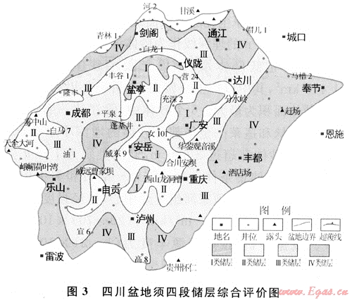 須四段主要以Ⅱ、Ⅲ類(lèi)儲(chǔ)層為主,Ⅰ類(lèi)儲(chǔ)層分布較少。Ⅰ類(lèi)儲(chǔ)層儲(chǔ)層范圍比須二段廣,主要分布在荷包場(chǎng)、潼南、廣安、八角場(chǎng)及蓬基等地區(qū),這些地區(qū)巖石成熟度較高,雜基和軟性巖屑含量較少,成巖相主要為綠泥石膠結(jié)相和溶蝕相,都位于三角洲水下分流河道微相帶,原生粒間孔隙保存較好,同時(shí)長(zhǎng)石含量高,又位于(或鄰近)生烴中心,溶蝕作用強(qiáng)烈。Ⅱ類(lèi)儲(chǔ)層的分布主要位于充深、蓮池、威東、營(yíng)山和川西南地區(qū)(圖3)。
