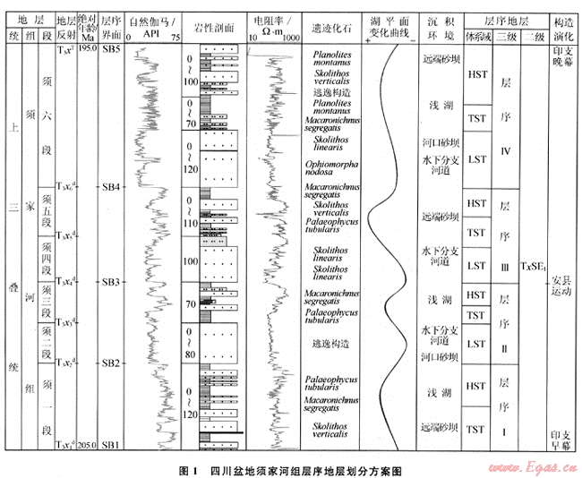 綜合地震、測(cè)井、鉆井和野外露頭資料,將須家河組劃分為4個(gè)三級(jí)層序,每個(gè)層序可進(jìn)一步識(shí)別出低位、水進(jìn)和高位3個(gè)體系域。層序Ⅰ對(duì)應(yīng)于須家河組一段(須一段),層序Ⅱ?qū)?yīng)于須二段和須三段,層序Ⅲ對(duì)應(yīng)于須四段和須五段,層序Ⅳ對(duì)應(yīng)于須六段(圖1)。