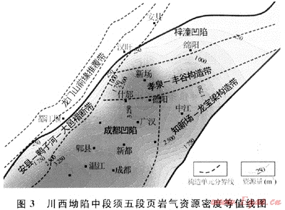 采用網(wǎng)格剖分法可對研究區(qū)得資源量進行平面上的微元分析,即根據(jù)各微元的頁巖厚度、頁巖含氣量(頁巖中的氣體吸附率按50%[22]計算)、巖石密度以及總有機碳含量等,可對研究區(qū)內(nèi)須五段的頁巖氣資源密度進行平面計算,進一步通過微元積分法亦可得研究區(qū)頁巖氣資源總量。以川西坳陷中段為例(圖3),資源密度等值線高值主要集中在新場德陽-廣漢-新都-溫江-大邑一線的成都凹陷,表明該區(qū)可作為頁巖氣進一步勘探研究的有利目標區(qū)。
