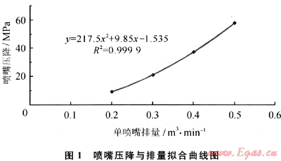 (式中Q為排量;A為過流面積)。因此,對(duì)試驗(yàn)測定結(jié)果進(jìn)行平方擬合即可得到噴嘴壓降與排量的關(guān)系,對(duì)常用Ø6mm噴嘴進(jìn)行擬合(圖1)得到如下關(guān)系式: