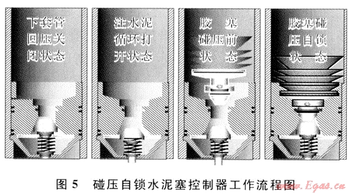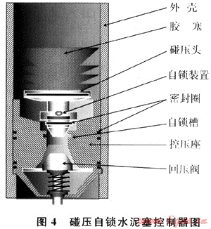 碰壓自鎖水泥塞控制器(圖4)上部采用碰壓膠塞與控壓座構成碰壓自鎖機構,下部采用回壓閥與控壓座構成回壓控制機構。它主要由外殼、控壓座、碰壓自鎖膠塞、回壓閥等部分組成。