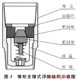 支撐式浮箍主要由外殼、加強環(huán)、密封座、球形密封體或錐形密封體、彈簧和球藍等構成(圖2、圖3)。其特點在于所用球形密封體或錐形密封體在彈簧的支撐作用下,能夠與密封座相吻合形成密封缶構,在靜止狀態(tài)和受反向回壓時保持關閉密封狀態(tài);在正循環(huán)時,可通過壓縮彈簧使密封體與密封座分離打開循環(huán)通道,保持循環(huán)暢通。當彈簧在井下工作的時間較長,反復壓縮次數(shù)多時有可能產(chǎn)生疲勞,所以對彈簧質量要求較高。球形密封體表層膠皮具有良好的補償性,但膠皮容易損壞甚至脫落,錐形密封體耐磨性較好不容易損壞。球形密封體或錐形密封體在受彈簧支撐的同時,自由度也受到一定的限制,較容易發(fā)生異物阻卡而影響關閉效果。