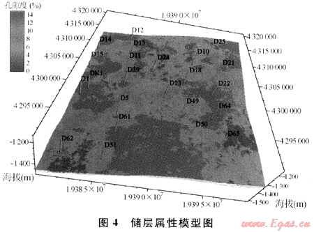 以測井解釋的孔隙度數(shù)據(jù)為基礎(chǔ),以各微相的孔隙度統(tǒng)計函數(shù)作控制,應(yīng)用相控建模技術(shù),采用序貫高斯模擬算法,建立研究儲層段的三維孔隙度模型(圖4)。