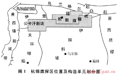 杭錦旗探區(qū)(包括杭錦旗區(qū)塊和杭南區(qū)塊)位于鄂北,橫跨伊盟隆起和伊陜斜坡兩大一級構造單元,總面積為9825km2。根據(jù)基底頂面起伏、蓋層發(fā)育情況以及構造形態(tài)特征,該區(qū)又可劃分為烏蘭格爾凸起、公卡漢凸起、杭錦旗斷階、伊陜斜坡及天環(huán)向斜一角等5個次一級構造單元(圖1)[20~21]。在地形特征上,杭錦旗探區(qū)是鄂北地區(qū)長期繼承性古隆起,被認為是鄂北油氣運移的有利區(qū)。