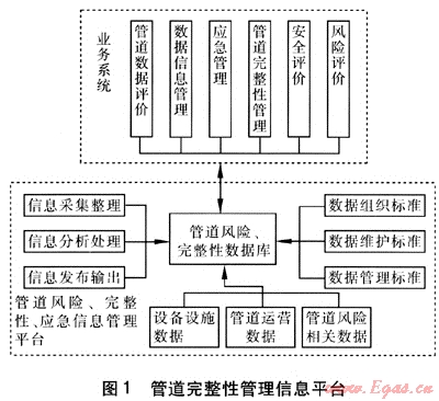 實現(xiàn)管道完整性管理信息共享平臺可以定位在兩個方面:一是實現(xiàn)天然氣管道各業(yè)務部門的風險管理功能,通過它實現(xiàn)各級部門與基層間的完整性管理信息共享;二是作為天然氣管道應急指揮平臺,通過它對風險與應急數(shù)據庫進行優(yōu)化與智能化處理。管道完整性管理信息平臺見圖1。