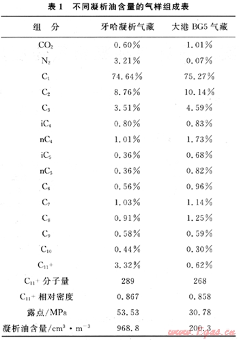 在本次研究中,分別采用了大港油田BG5氣藏和塔里木牙哈凝析氣藏的兩種代表性流體樣品。兩種凝析氣樣品的露點(diǎn)和凝析油含量差別比較大,具體組成和性質(zhì)參數(shù)見(jiàn)表1。
