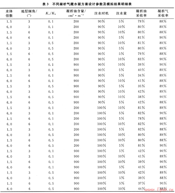 在前面凝析氣藏水驅(qū)方案確定之后,利用Eclipse數(shù)值模擬軟件的組分模擬器E300對(duì)其進(jìn)行了模擬運(yùn)算,其結(jié)果見(jiàn)表3。