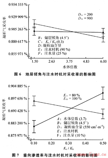 而由圖3可以看出各因素對(duì)于凝析氣的采收率影響的重要程度由高到低依次為:底水體積和凝析油含量的交互作用、垂向滲透率和注入時(shí)間及注水量的交互作用、注水體積、垂向滲透率和注入時(shí)機(jī)的交互作用等。