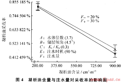 對(duì)于凝析油含油比較高的凝析氣藏需要的注水量相對(duì)較大,而對(duì)于凝析油含量較小的凝析氣藏,存在一個(gè)最優(yōu)的注水量使得凝析油氣總的采收率最大。