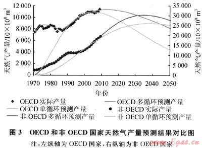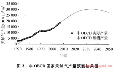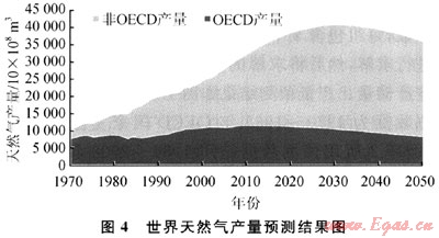 通過預(yù)測,世界天然氣產(chǎn)量峰值將于2031年左右到來,峰值產(chǎn)量約為4.04×1012m3,最終可采儲量約為395.21×1012m3。同時,對比0ECD國家與非OECD國家的產(chǎn)量曲線可以看出,0ECD國家未來的產(chǎn)量增長空間較小,到2013年后產(chǎn)量將逐漸減?。欢荗ECD國家產(chǎn)量增長空間較大。因此,我國在確定天然氣發(fā)展戰(zhàn)略時,應(yīng)將非0ECD國家列為主要戰(zhàn)略合作國,及早加強(qiáng)合作。