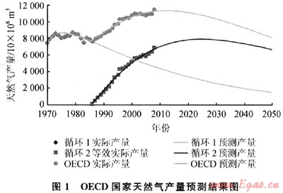 對于存在2個產(chǎn)量循環(huán)的地區(qū)而言,需要求解2組參數(shù),每組包含3個參數(shù),運(yùn)用線性試差法對待定參數(shù)進(jìn)行求解,然后將求解的參數(shù)代入產(chǎn)量和儲量公式確定產(chǎn)儲量。產(chǎn)量預(yù)測結(jié)果如圖1所示。循環(huán)1所用預(yù)測數(shù)據(jù)為1970~1985年OECD國家實(shí)際產(chǎn)量數(shù)據(jù),循環(huán)2所用預(yù)測數(shù)據(jù)是用1986~2008年OECD國家實(shí)際產(chǎn)量數(shù)據(jù)減去同期循環(huán)1的預(yù)測數(shù)據(jù)得到的等效實(shí)際產(chǎn)量數(shù)據(jù),然后將二者的預(yù)測結(jié)果疊加,得到OECD國家天然氣產(chǎn)量預(yù)測的最終結(jié)果。同理可得非OECD國家的天然氣產(chǎn)量預(yù)測結(jié)果(圖2)。