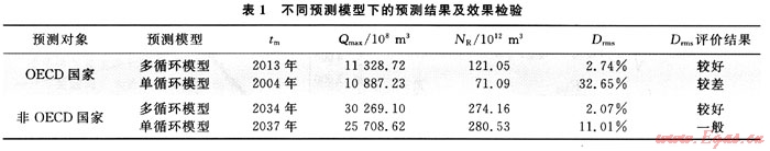 為了說明多循環(huán)模型在預(yù)測產(chǎn)量方面的比較優(yōu)勢,運(yùn)用單循環(huán)廣義翁氏模型對0ECD國家和非OECD國家天然氣產(chǎn)量進(jìn)行預(yù)測,將其與多循環(huán)廣義翁氏模型的預(yù)測結(jié)果進(jìn)行對比,見圖3和表1。