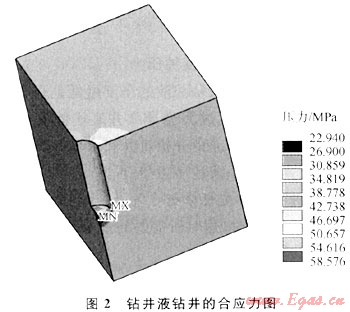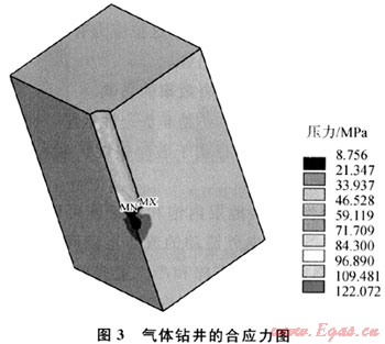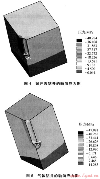 用ANSYS有限元軟件模擬了井深3000m鉆井液鉆井和氣體鉆井的地層地應(yīng)力(規(guī)定拉應(yīng)力為正,壓應(yīng)力為負(fù)),從圖2、3可以看出,氣體鉆井時(shí)井底巖石應(yīng)力值比鉆井液鉆井時(shí)井底巖石的應(yīng)力值要小很多,比如圖3中氣體鉆井時(shí)井底巖石的應(yīng)力最小值只有8.756MPa,而鉆井液鉆井時(shí),井底巖石的應(yīng)力最小值約22.94MPa。根據(jù)第四強(qiáng)度理論得到的氣體鉆井時(shí)井底巖石是處于低應(yīng)力狀態(tài),此條件下的巖石的強(qiáng)度和塑性均比較小,比較容易破壞。從圖4、5分析垂直于井底方向的應(yīng)力,鉆井液鉆井時(shí)井底為壓應(yīng)力,氣體鉆井時(shí),井底巖石受到沿井眼軸向向上的拉應(yīng)力,井底中心的拉應(yīng)力大小為14.28MPa,逐漸向外圍擴(kuò)大,井壁處的拉應(yīng)力為0.647MPa。這拉應(yīng)力有“拉斷巖石,使井底巖石跳離井底”的趨勢(shì)。