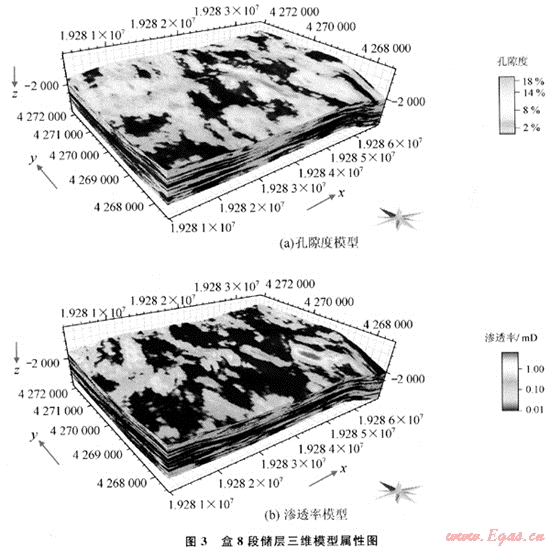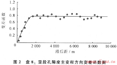 從表2中可以看出:由于盒8上亞段儲(chǔ)層和盒8下亞段儲(chǔ)層分別為曲流河和辮狀河沉積相,其儲(chǔ)層屬性的變差函數(shù)存在較大的差異。以孔隙度為例,雖然二者的主變程方向都為近于南北向,并且都可以用指數(shù)模型進(jìn)行擬合,但盒8上亞段儲(chǔ)層變差函數(shù)的主變程是1645m,而盒8下亞段儲(chǔ)層是819m,說(shuō)明盒8上亞段儲(chǔ)層孔隙度沿主變程方向連續(xù)性更好。但是盒8上亞段儲(chǔ)層孔隙度次變程為425m,比盒8下亞段儲(chǔ)層孔隙度次變程503m要短68m,說(shuō)明盒8上亞段儲(chǔ)層孔隙度側(cè)向變化比盒8下亞段快。二者的垂直變差函數(shù)分別為7.8m和6m,說(shuō)明孔隙度在垂直方向上變化遠(yuǎn)比平面方向變化快,也就是說(shuō),儲(chǔ)層的垂直方向的非均質(zhì)性遠(yuǎn)強(qiáng)于平面非均質(zhì)性。盒8上亞段與盒8下亞段儲(chǔ)層滲透率變差函數(shù)具有相似的變化規(guī)律,只是主變程和次變程都比孔隙度小,說(shuō)明滲透率在各方向的變化都比孔隙度快,反映儲(chǔ)層滲透率的非均質(zhì)性比孔隙度強(qiáng)。由此可見(jiàn),準(zhǔn)確變差函數(shù)的求取,可有效反映儲(chǔ)層非均質(zhì)性大小及方向。