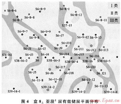 由于儲(chǔ)層屬性模型提供了空間任意位置孔隙度、滲透率的變化,所以可以準(zhǔn)確地預(yù)測(cè)有效儲(chǔ)層的空間分布。如圖4所示為盒8上亞段2層有效砂體平面分布預(yù)測(cè)結(jié)果。依據(jù)儲(chǔ)層孔隙度和滲透率的大小,可以將盒8段儲(chǔ)層砂體分為以下3類(lèi)。