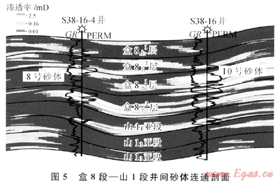 由此可見(jiàn),應(yīng)用儲(chǔ)層三維地質(zhì)模型,可以準(zhǔn)確地預(yù)測(cè)有效儲(chǔ)層的規(guī)模及其空間分布,通過(guò)沿任意方向切取垂向和水平剖面,可以對(duì)儲(chǔ)層進(jìn)行定量評(píng)價(jià)。圖5為通過(guò)儲(chǔ)層滲透率三維模型切取的過(guò)井剖面,從圖中可以直觀(guān)地看出儲(chǔ)層砂體的井間連通或者尖滅情況,定量分析儲(chǔ)層物性的橫向變化,準(zhǔn)確地界定儲(chǔ)層砂體的幾何形態(tài)。如S38-16井生產(chǎn)近半年,關(guān)井63d,在盒8下亞段1層第10號(hào)砂體測(cè)得地層壓力為19.7MPa,而S38-16-4井在同一地層的8號(hào)砂體地層壓力為29.3MPa,反映兩口井砂體不連通或物性差別極大,與儲(chǔ)層地質(zhì)模型基本吻合。通過(guò)工區(qū)內(nèi)16口測(cè)壓井、2個(gè)井組干擾試驗(yàn)以及投產(chǎn)井生產(chǎn)動(dòng)態(tài)特征,證實(shí)了所建立的三維地質(zhì)模型精度較高,客觀(guān)地反映了有效儲(chǔ)層空間分布,也表明所提出的建模方法對(duì)低滲透河流相儲(chǔ)層建模是有效的。