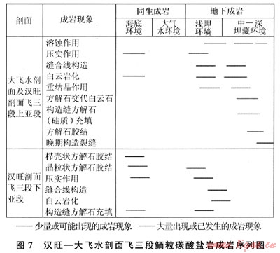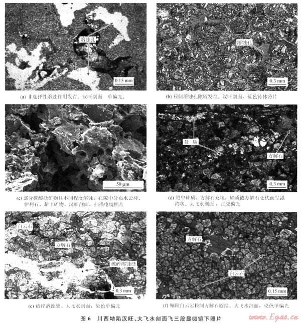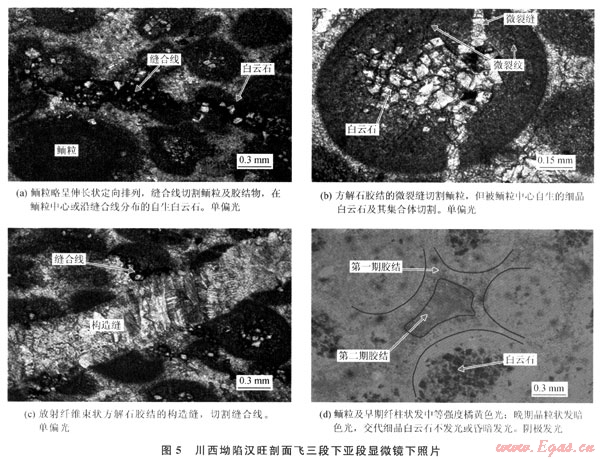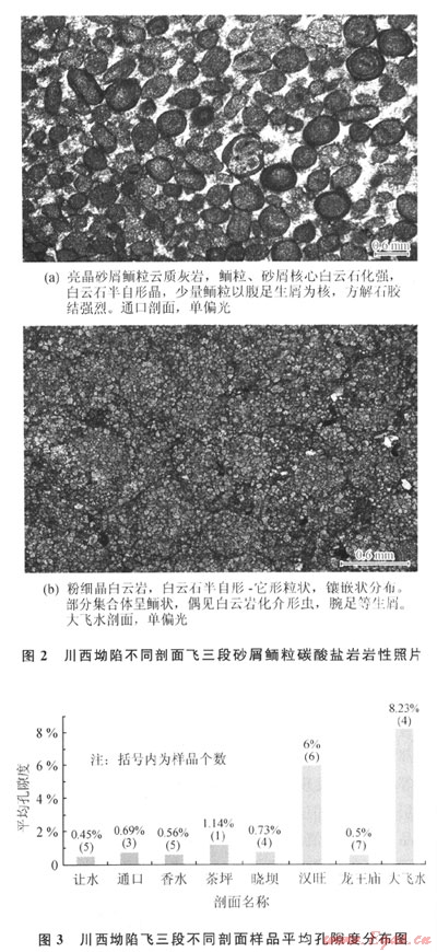從成巖序列來看,川西坳陷北段南部與南段的成巖作用有明顯的差異,北段南部以海底成巖、淺埋成巖作用為主,而南段大飛水剖面以埋藏成巖作用為主,中、深埋藏成巖作用顯著??傮w上,飛三段成巖作用在平面上由北向南,成巖作用由海底向埋藏成巖變化。北段南部(如漢旺剖面下亞段)經(jīng)歷了明顯的海底成巖作用,纖維狀等厚環(huán)邊、粒狀方解石膠結(jié)普遍發(fā)育,這使原始粒間孔隙顯著減小。在埋藏成巖環(huán)境中,壓實、壓溶和膠結(jié)作用使孔隙度進一步降低,而鮞粒內(nèi)及沿縫合線分布的白云巖化作用,對孔隙度影響較小,使最終孔隙度很低。漢旺剖面上亞段和南段(大飛水剖面)的成巖作用相似,埋藏期的壓實作用較強烈,白云巖化可能均為埋藏成因,重結(jié)晶現(xiàn)象較強烈且未發(fā)現(xiàn)同生成巖期大氣水溶蝕作用形成的鮞粒鑄??祝砻骺赡芘c埋藏溶蝕作用有關(guān),中-晚期溶蝕作用是孔隙發(fā)育的重要因素。