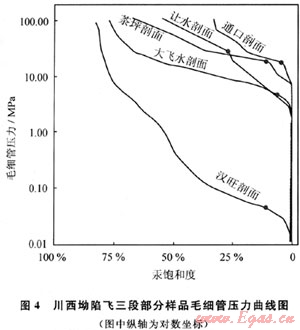 對上述8個剖面(圖1)的飛三段35個砂屑鮞粒結(jié)構(gòu)石灰?guī)r(白云巖)樣品的孔隙度進行了測試。結(jié)果顯示,孔隙度平均值為2.39%(圖3),高于四川盆地碳酸鹽巖有效儲集巖評價標(biāo)準(zhǔn)的孔隙度下限值(下限值為2%,參照SY/T 6110-2002碳酸鹽儲集巖級別劃分和四川碳酸鹽巖儲集巖分類方法),暗示該區(qū)飛三段砂屑鮞粒碳酸鹽巖為重要的潛在儲集巖。然而,孔隙度范圍變化較大(0.18%~16.98%),顯示樣品的非均質(zhì)性較強,如北段南部通口等剖面的砂屑鮞粒碳酸鹽巖孔隙度平均值多低于1%(圖3),孔隙結(jié)構(gòu)為小孔微喉或微孔微喉型組合,毛細(xì)管壓力曲線特征顯示出細(xì)-極細(xì)歪度,分選差極差(圖4),顯微鏡下觀察也顯示,這些剖面樣品的亮晶方解石膠結(jié)作用非常發(fā)育,應(yīng)是孔隙度降低的重要原因;而在漢旺剖面飛三段上亞段,見有粒間溶孔發(fā)育的鮞粒白云巖,孔隙度最大值可達16.71%,孔隙結(jié)構(gòu)為大孔中粗喉,毛細(xì)管壓力顯示出略粗歪度,分選差的特征(圖4),可能為不均勻溶蝕作用的結(jié)果;南段大飛水剖面的4個樣品孔隙度平均為8.23%(圖3),巖性為重結(jié)晶殘余砂屑鮞粒細(xì)晶白云巖,孔隙類型主要為白云石晶間(溶)孔,孔隙結(jié)構(gòu)為中孔細(xì)喉,毛細(xì)管壓力曲線顯示出分選好,細(xì)歪度的特征(圖4),儲集性能為中等-差。